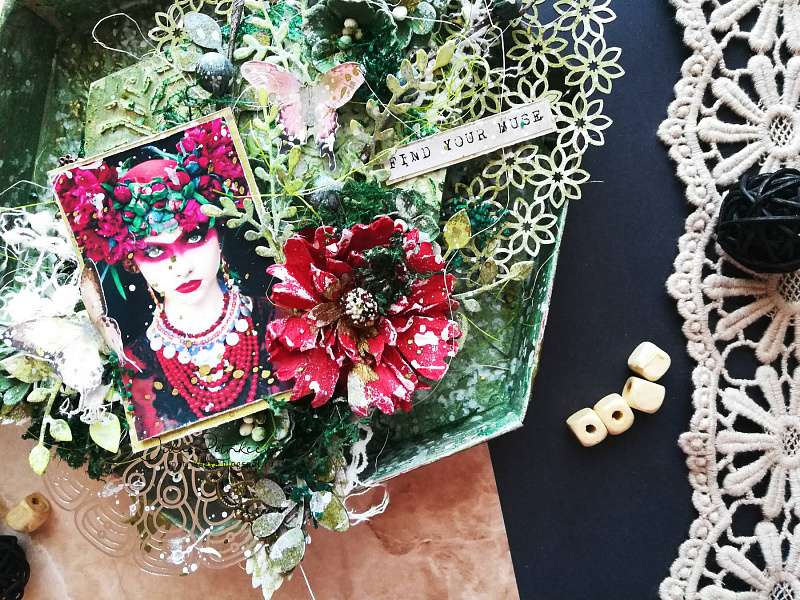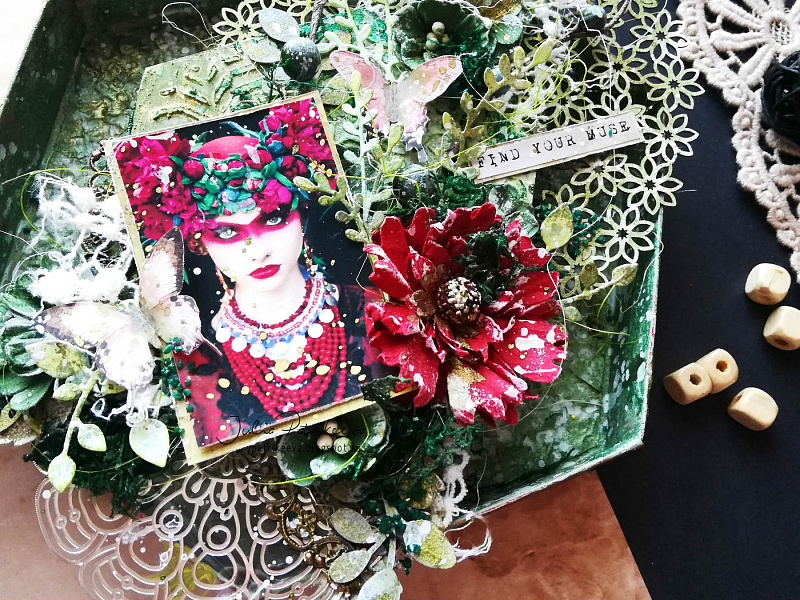 Привет всем! Сегодня с вами я, Юлия Патрикеева, и мы будем создавать изумрудный холст.А вот и он.Необычной формы - шестиугольник. В основе коробочка от конфет) Глубокие изумрудные ...