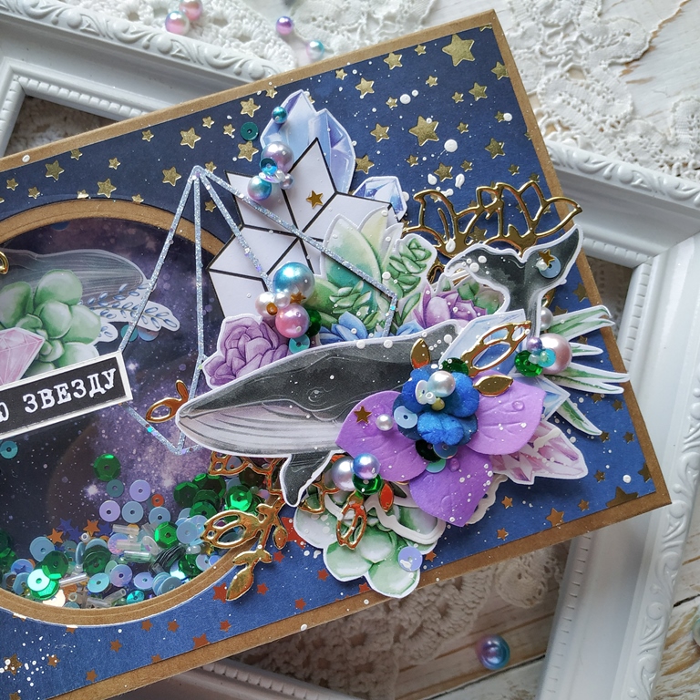 Всем привет! Сегодня хочу показать вам открытку с космическими китами. Новая коллекция бумаги "Mystical space" невероятно красивая. Именно ее я использовала в своей работ ...