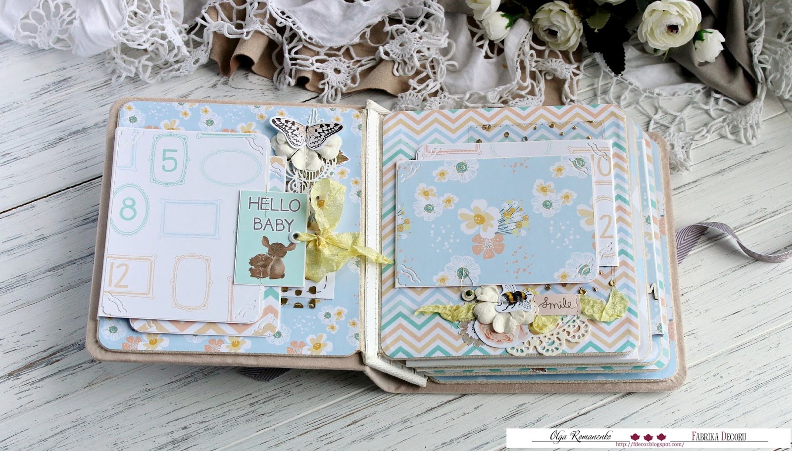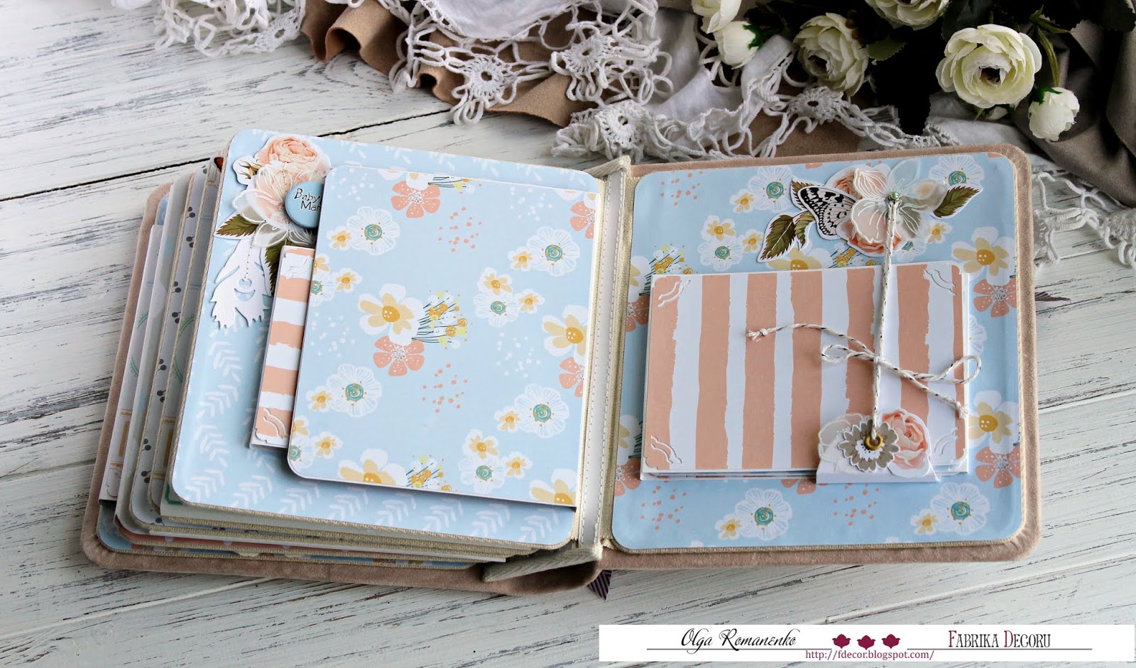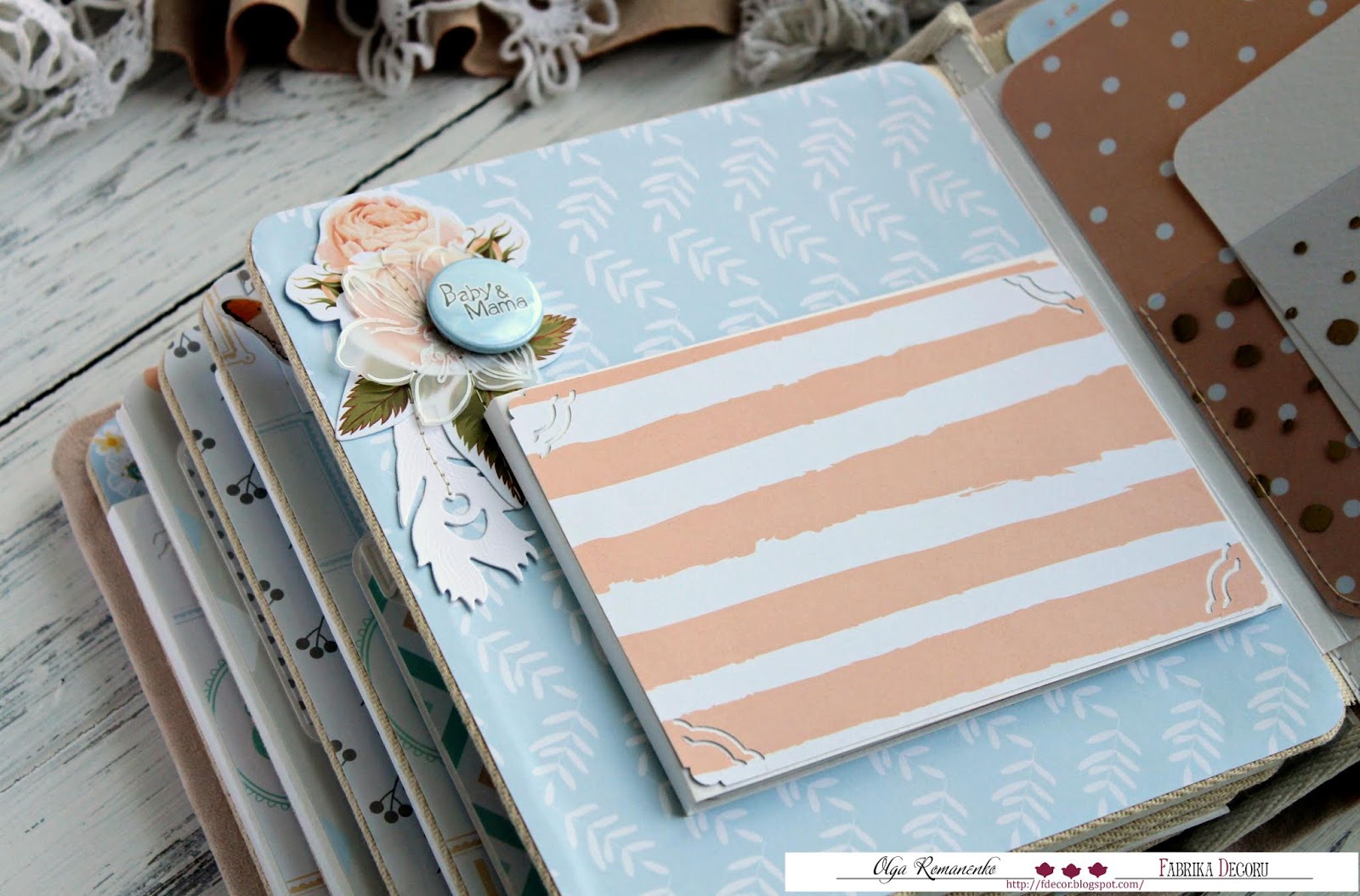 Всем солнечный летний привет!! Сегодня с вами я, Ольга Романенко, и хочу показать вам детский альбом. Делала его по вдохновению и с большим удовольствием! Коллекция "BABY & MAMA" далеко не новая, но уже успела завоевать сердца многих мастеров. Я хотела попробовать сделать альбом небольшого размера, но вместительный! Так же мне хотелось сделать альбом нежным, в пастельных тонах, без привязки к полу. Результатом я довольна!) Размер альбома 20/18 в прочном прошитом тканевом переплете, на 5 разворотов. В альбоме много разных открывашек, конвертиков....одним словом, вместительный.