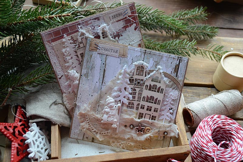Теги: новогодняя бумага, открытки на новый год, вдохновение, Андреева Наталья, Искусственный снег (мелкие частицы), домики, новогодние открытки
