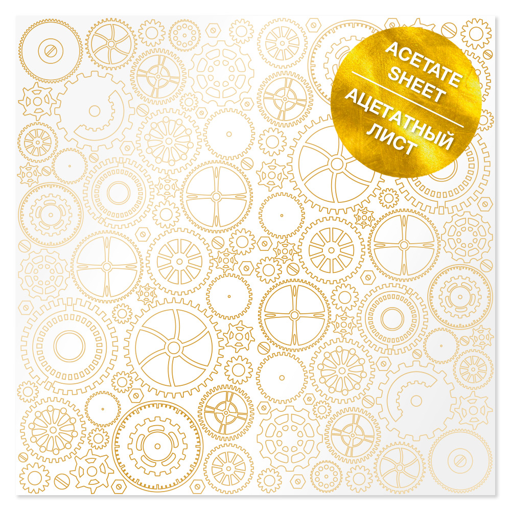 Ацетатный лист с золотым узором Golden Gears, 30,5см х 30,5см- прозрачная пластиковая пленка с нанесенным золотым узором. Материал широко используется в скрапбукинге, кардмейкинге, как элемент декора, для создания конвертов, подарочной упаковки, разделителей для альбомов и блокнотов.