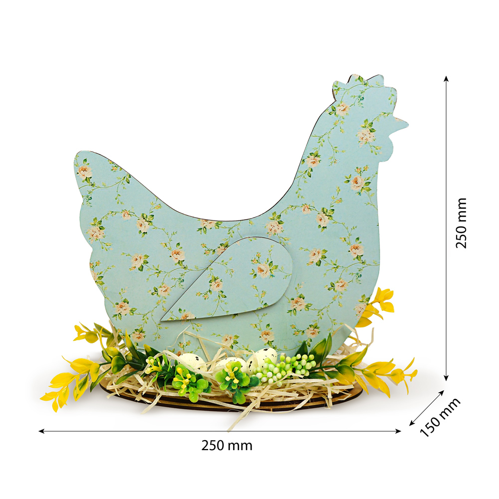 Готовая декоративная композиция с курочкой — стильное решение для весеннего и пасхального оформления интерьера. Изделие полностью подготовлено к использованию: достаточно установить фигурку на подставку, входящую в комплект, и пространство сразу приобретает праздничное настроение и уют.