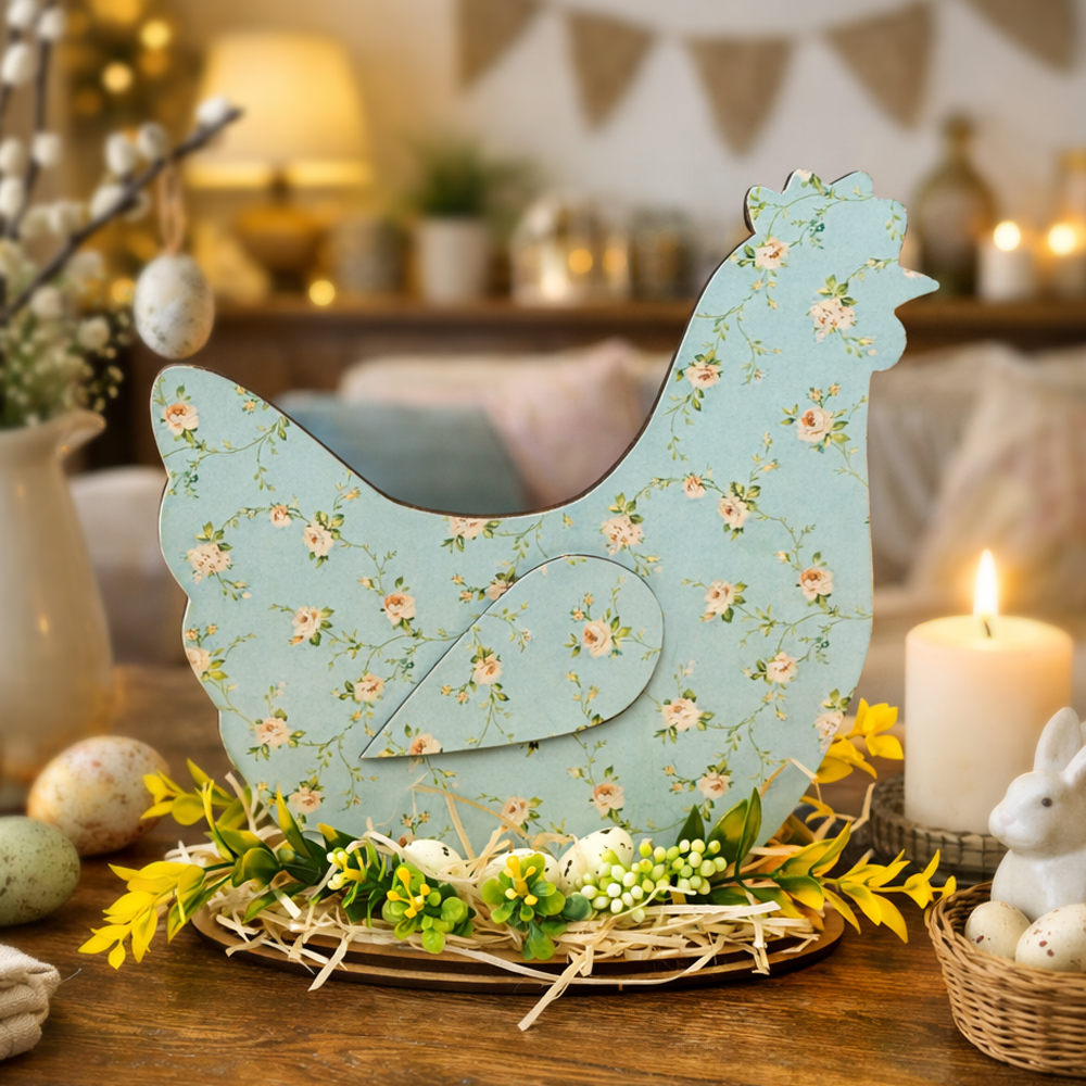 Элементы выполнены из прочного ХДФ толщиной 3 мм. Лицевая сторона оформлена декоративной бумагой с весенним принтом, подчёркивающим сезонный характер композиции и создающим мягкую, уютную атмосферу Пасхи.