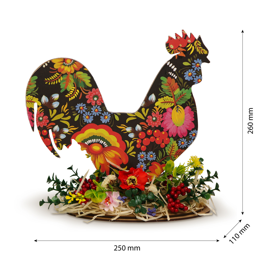 Фигурка выполнена из прочного ХДФ толщиной 3 мм. Лицевая сторона оформлена декоративной бумагой с насыщенным весенним орнаментом в народном стиле. Контрастные цвета и детализированный рисунок делают композицию заметной деталью в интерьере.