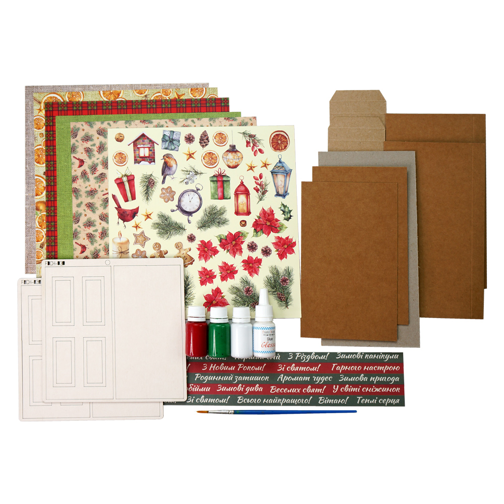 Дизайн выполнен в праздничной рождественско-новогодней тематике: декоративные дверцы, хвойные ветки, цветы пуансеттии, подарки, фонари и снежные акценты. Набор позволяет создать уникальное авторское изделие без специальных навыков.