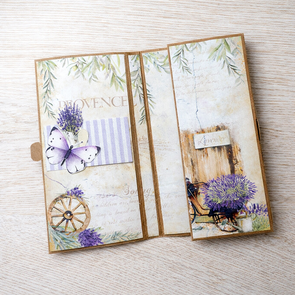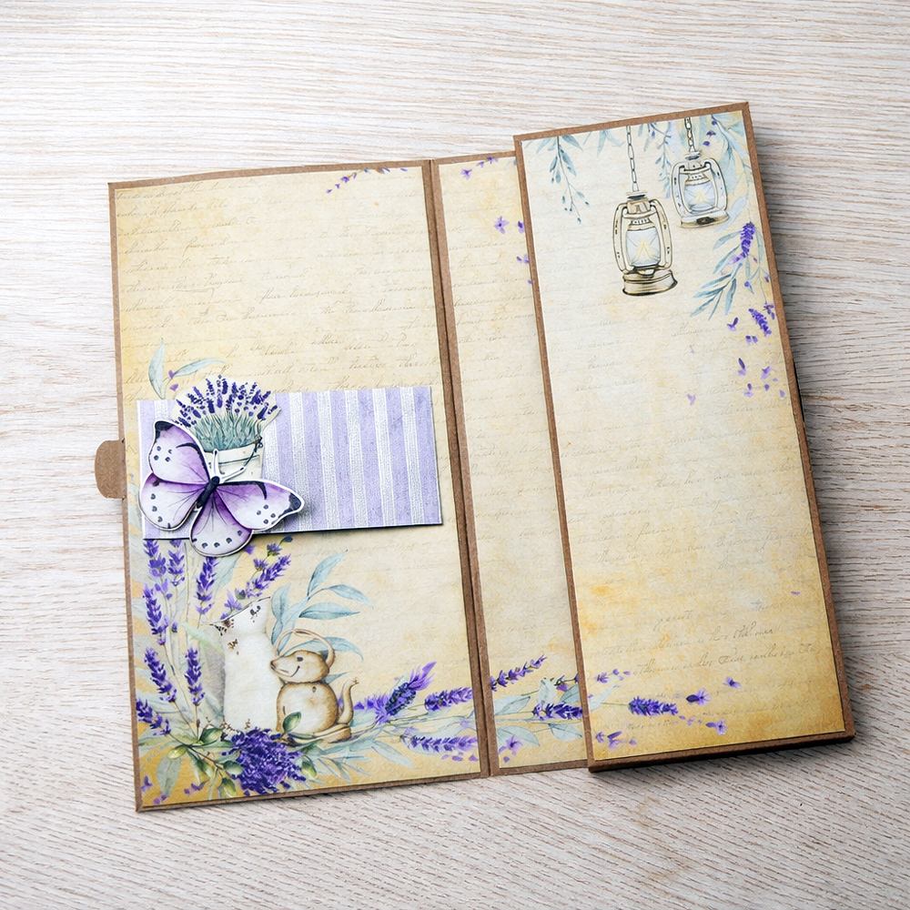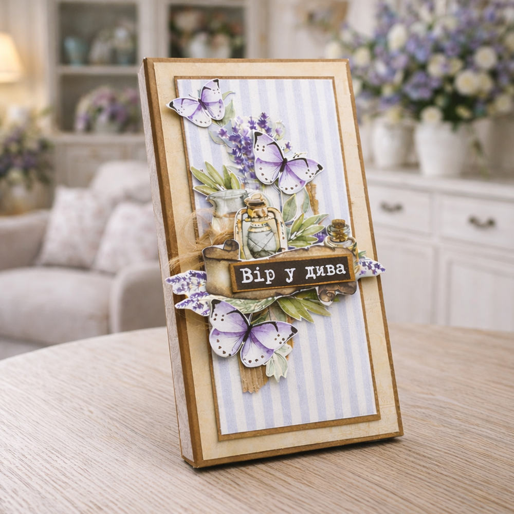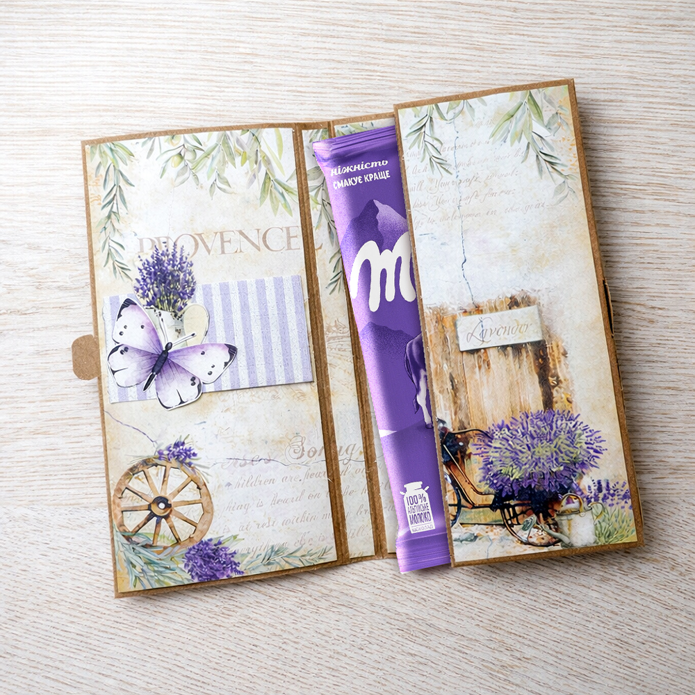 Набор для создания шоколадницы в нежном лавандовом стиле поможет оформить стильный и оригинальный подарок. Дизайн сочетает веточки лаванды, изящных бабочек и декоративные элементы, создающие атмосферу спокойствия, тепла и элегантности. Пастельная фиолетовая палитра придаёт работам лёгкость и утончённое настроение.