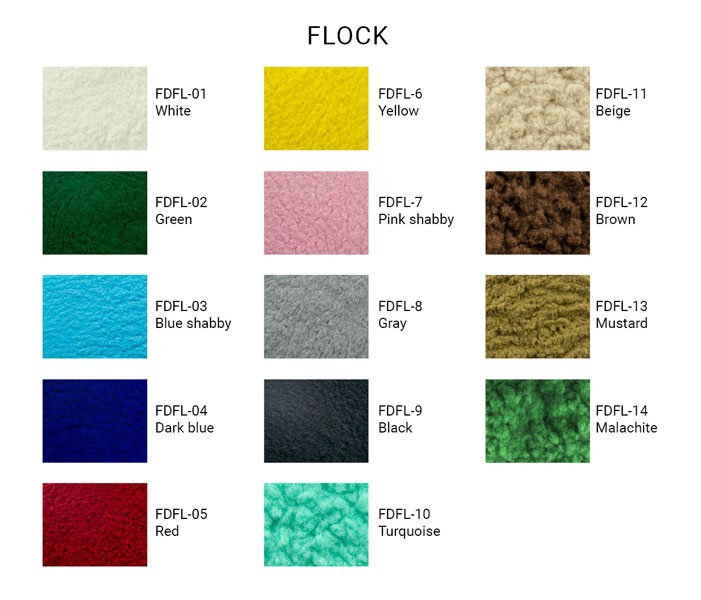 We also recommend using acrylic paint as a base if your creative project requires an area with a rich flock color. In this case, first, apply acrylic paint similar in tone to the color of velvet powder and dust this area immediately by powder. Then you should lightly crush the flock with your fingers or a dry brush, shake off the excess on paper.