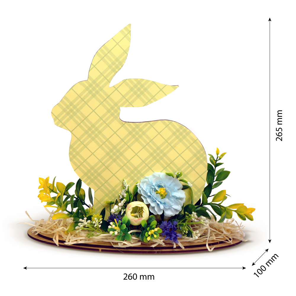 Фігура кролика виготовлена з міцного ХДФ товщиною 3 мм. Лицьова сторона акуратно оформлена кольоровим папером із весняним принтом, що підкреслює сезонний характер композиції та створює теплу атмосферу свята.